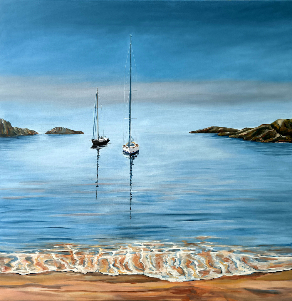 Segelyachten am Abend vor Sardinien, Acryl auf Leinwand, 90 x 90 cm, 2025